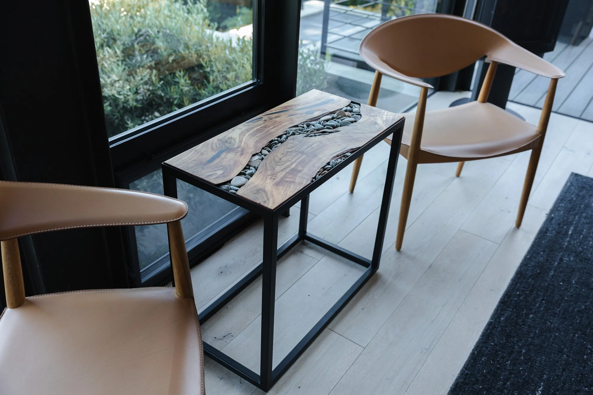 A final result of our collaboration, the Shadow Table embodies the intentionality of the custom design-build process. Yes – the table’s minimalistic, modern design compliments the architectural lines and materials of Bill’s picturesque home. And yes – it has the contrast of natural elements against black steel, as straight lines intersect with curves and natural grains.